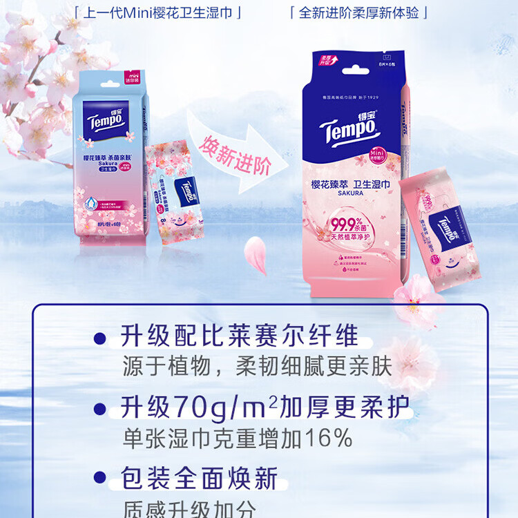 得宝(TEMPO)樱花杀菌湿巾 8片*6包 杀菌率99.9% 温和不刺激 湿纸巾 湿巾小包