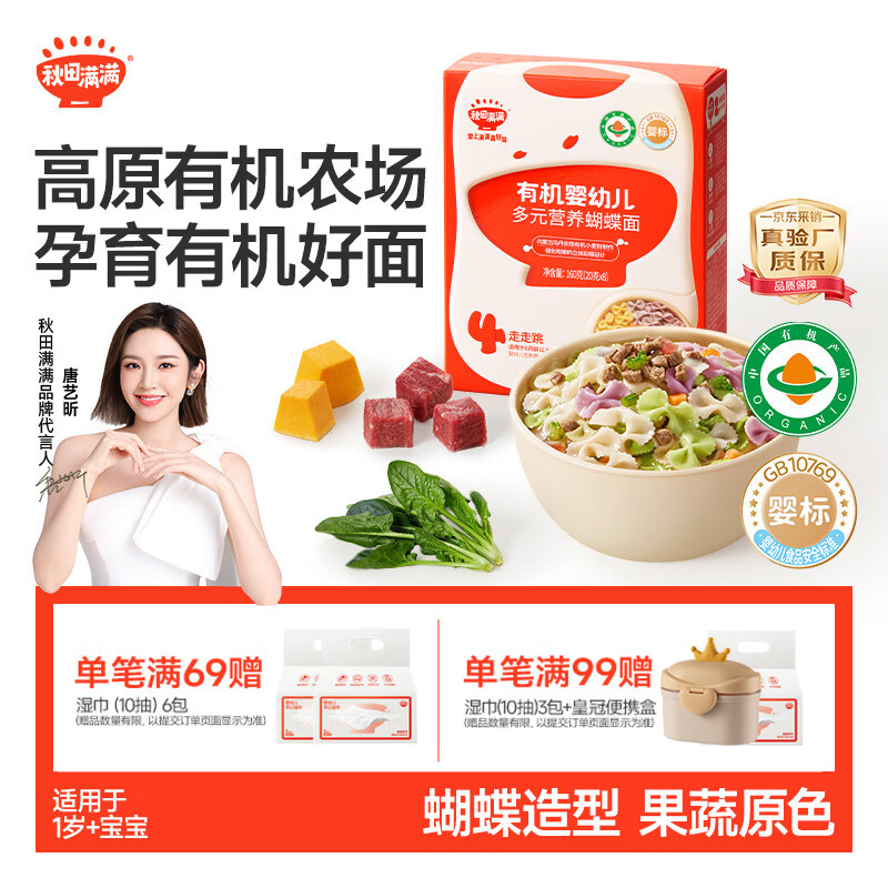 秋田满满有机蝴蝶面1-3岁宝宝面条160g婴儿辅食儿童早餐彩蝶面 100%真验厂