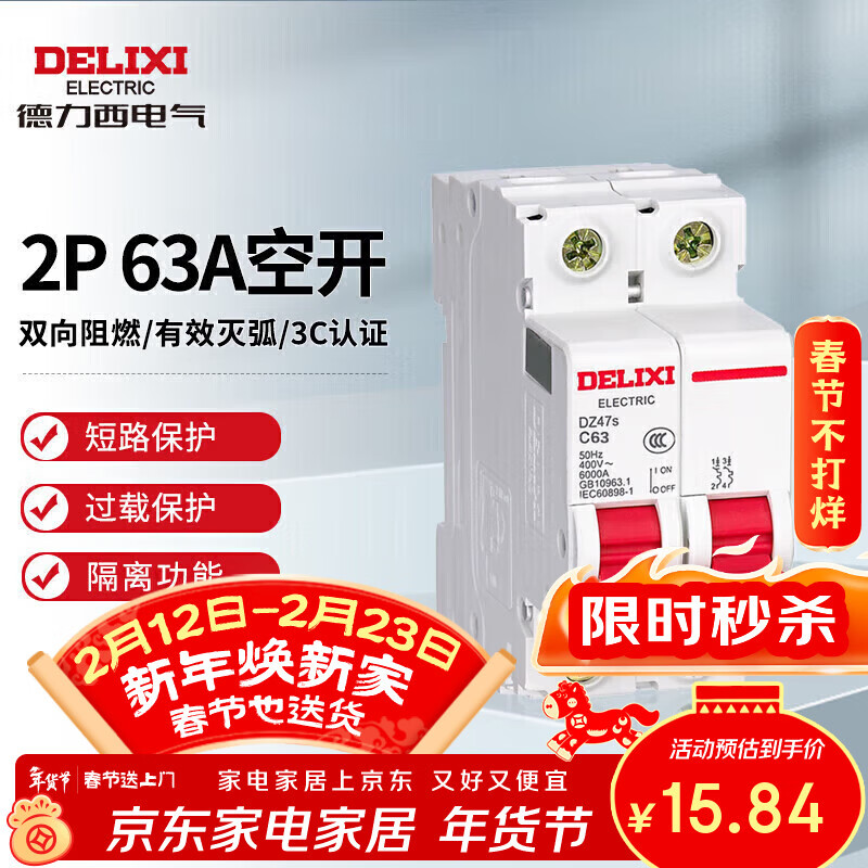 德力西电气空开微型断路器空气开关家用DZ47s 2P 63A