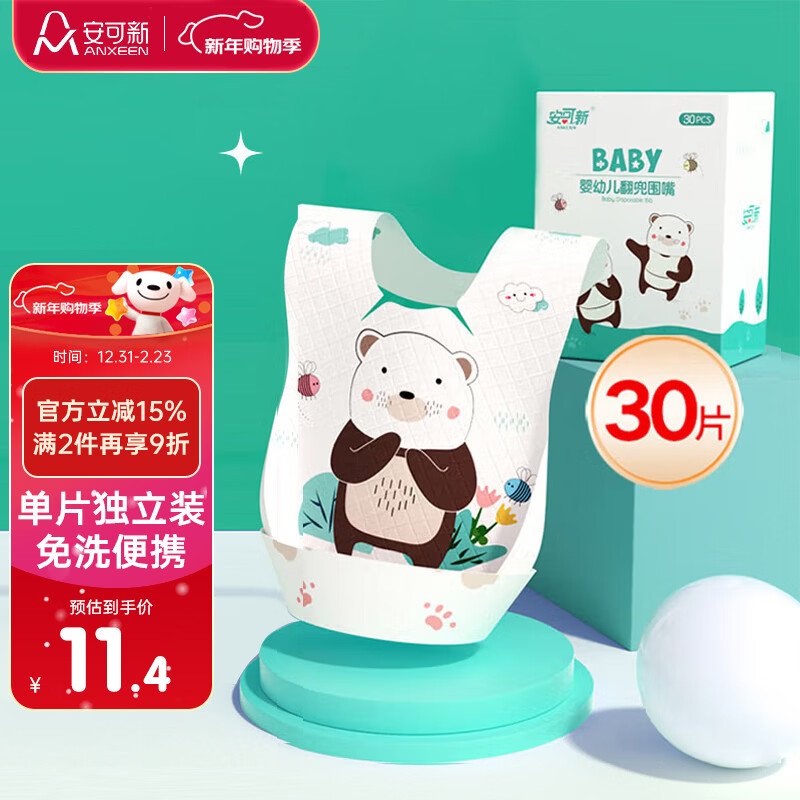 安可新 婴幼儿一次性翻兜围嘴【30片装】独立装宝宝免洗围兜口水巾 萌熊