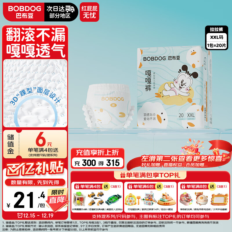 巴布豆(BOBDOG)嘎嘎裤拉拉裤裸感透气XXL20片(14-17KG)新生儿婴儿尿不湿