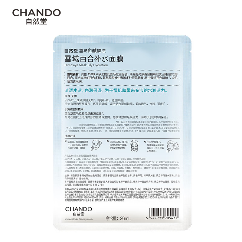 自然堂【周翊然同款】喜马拉雅膜法雪域百合补水面膜26ml*5片敏肌可用