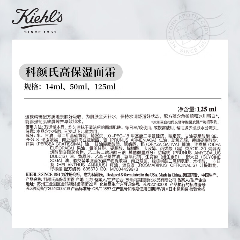 科颜氏(Kiehl's)全新第三代高保湿面霜125ml秋冬补水保湿滋润护肤品 生日礼物