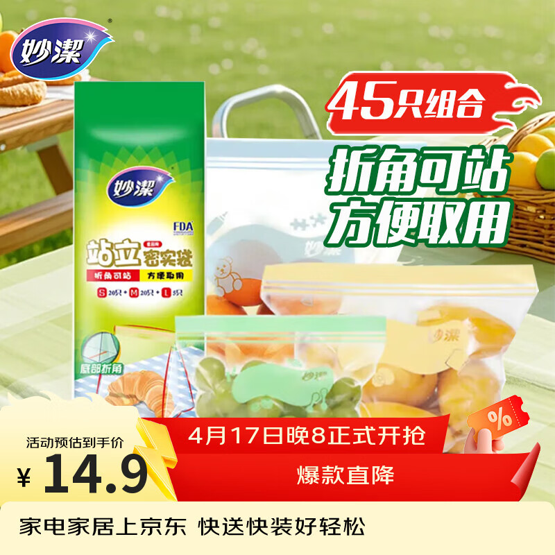 妙洁站立密封袋大中小号共45只密实封口袋食品级保鲜自封口塑拉链分装