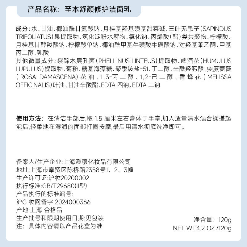 至本新版舒颜修护洁面乳120g 温和清洁氨基酸表活保湿泡沫绵密洗面奶