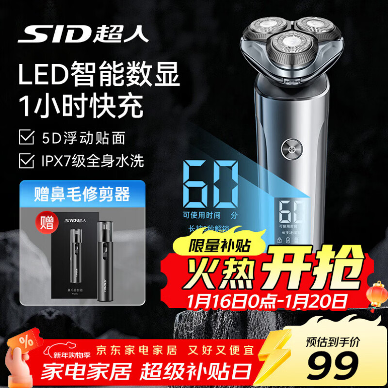 超人(SID)【圣诞礼物】男士电动剃须刀旋转式LED智能数显全身水洗TYPE-C快充刮胡刀节日礼物RS7375