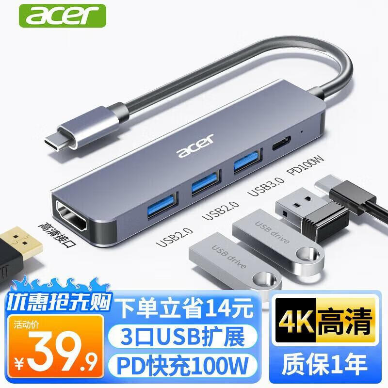 宏碁(acer)USB3.0分线器扩展坞 高速4口集线器HUB拓展坞 适用笔记本电脑转换器转接头延长线 Type-C供电