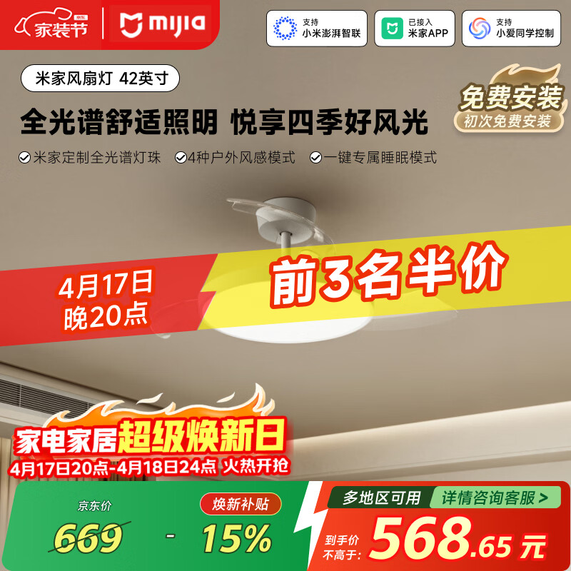 米家小米米家风扇灯吊扇灯隐形卧室42寸全光谱Ra97灯具【包安装】