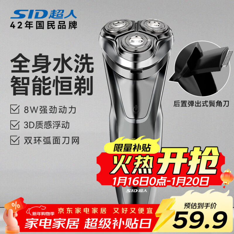 超人【出行必备】剃须刀电动刮胡刀男士车载充电式便携大功率剃胡须子刀全身水洗RS7350银