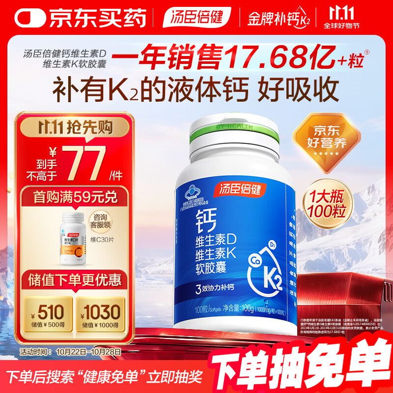 #预估0.72元佣金#10元优惠券汤臣倍健液体钙维生素d3软胶囊100粒钙片 成人女士中老年补钙折扣价¥102.00原价¥112.00汤臣倍健京东自营旗舰店·1000人购买