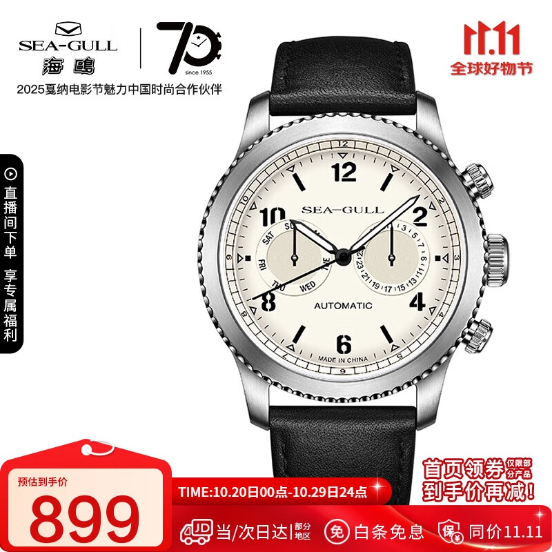#预估42.45元佣金#50元优惠券海鸥(SEAGULL)手表男自动机械表 日历星期双时区夜光男士手表生日礼物男表 白盘折扣价¥1007.65原价¥1057.65海鸥表京东自营旗舰店·33人购买