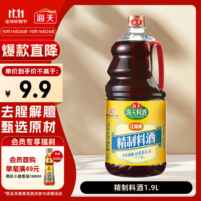 - #预估0.08元佣金#0.9元优惠券海天 料酒 1.9L 0添加防腐剂 调味品 酒香浓郁 去腥解膻 家用折扣价¥8.91原价¥9.81海天京东自营旗舰店·7000人购买