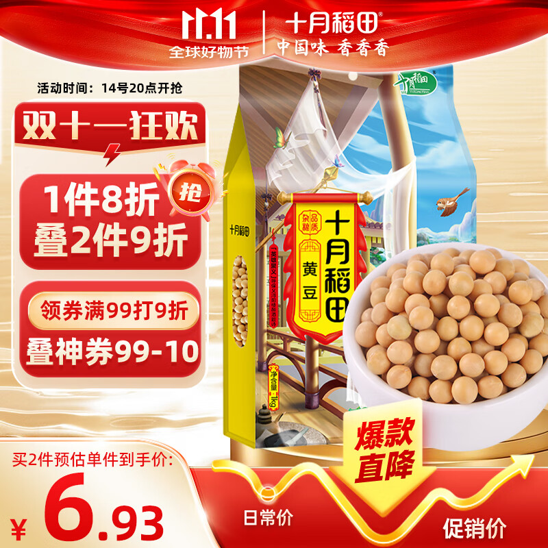 - #预估0.24元佣金#满1件享8.00折十月稻田 黄豆 2斤 打豆浆 可发豆芽 东北大豆 五谷杂粮 早餐 大米伴侣折扣价¥9.90十月稻田京东自营旗舰店·10000人购买