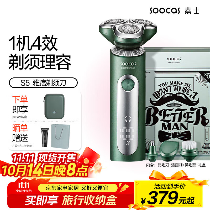 - #预估18.00元佣金#0.88元优惠券素士SOOCAS 男士剃须刀电动刮胡刀智能全身水洗多功能 S5雅痞理容礼盒送男友生日礼物折扣价¥359.92原价¥360.80素士个人护理京东自营旗舰店·29人购买