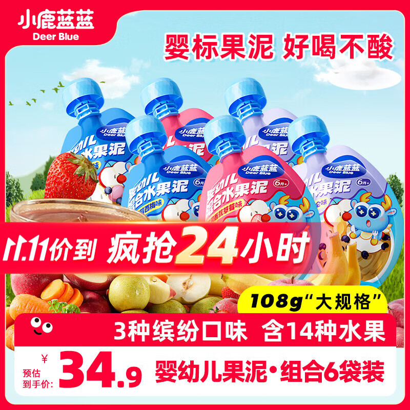 - #预估6.38元佣金#10元优惠券小鹿蓝蓝 婴标果泥婴幼儿果泥6包648g宝宝新鲜水果泥3种口味婴儿辅食折扣价¥34.90原价¥44.90小鹿蓝蓝京东自营旗舰店·1000人购买