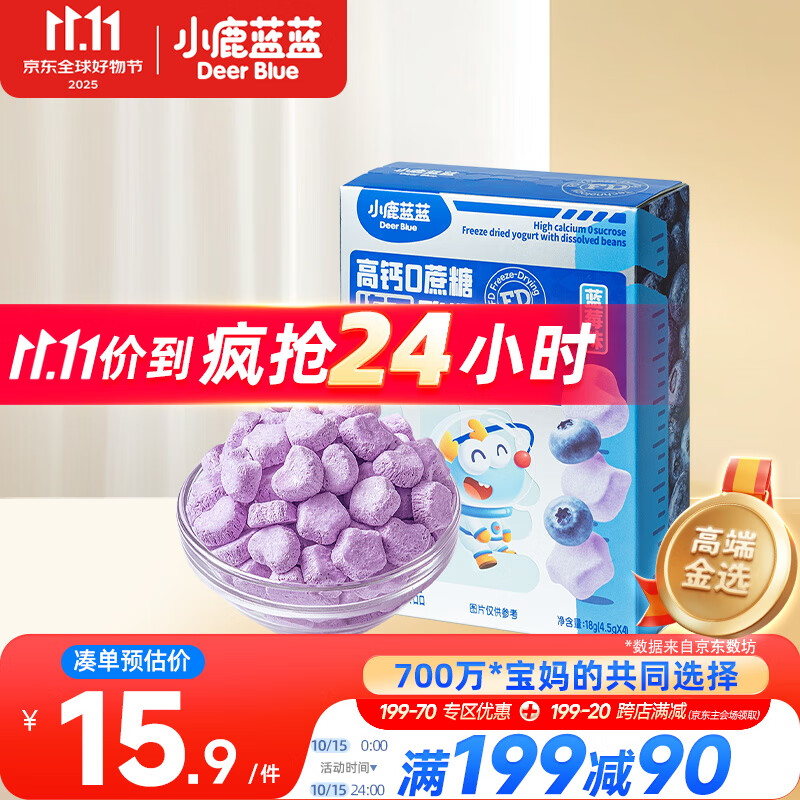 - #预估0.11元佣金#0.7元优惠券小鹿蓝蓝新版冻干酸奶溶豆蓝莓味 宝宝零食易溶 高钙0蔗糖18g约72粒 10月+折扣价¥12.00原价¥12.70小鹿蓝蓝京东自营旗舰店·1000人购买