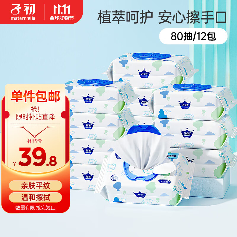 - #预估5.77元佣金子初婴儿湿纸巾 宝宝手口柔湿巾 儿童擦脸绵柔湿巾80抽12包折扣价¥39.80子初京东自营旗舰店·2000人购买