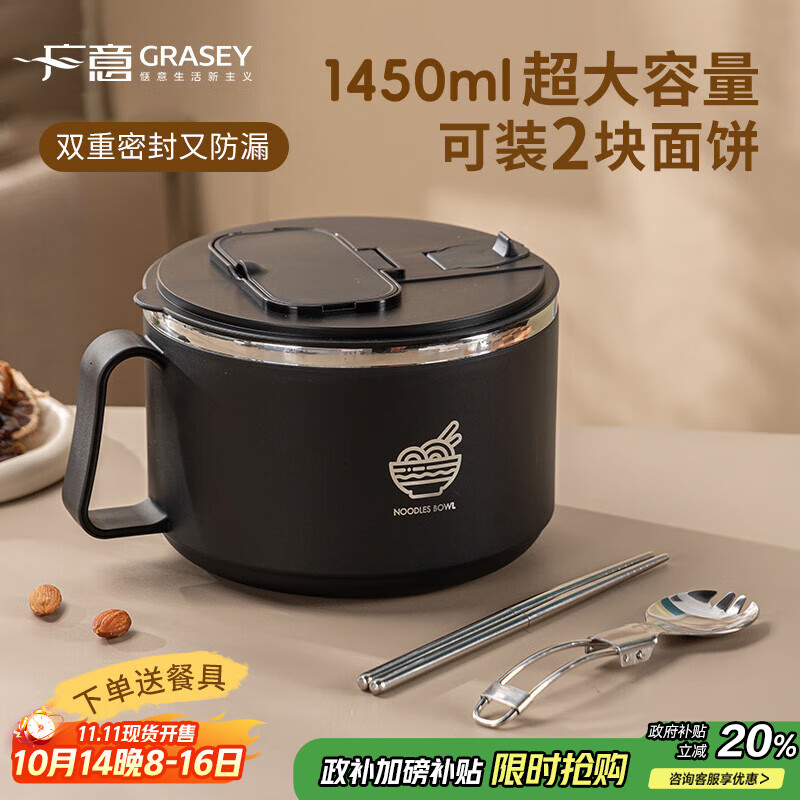 - #预估0.66元佣金广意 304不锈钢泡面碗 学生上班族饭盒大容量大号 黑色配勺筷GY7348折扣价¥25.90广意京东自营旗舰店·800人购买