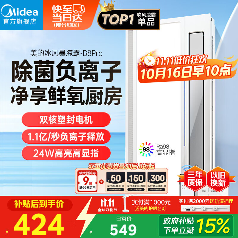 - #预估14.82元佣金#0.9元优惠券美的(Midea)凉霸厨房卫生间集成吊顶照明一体遥控排气换气吹风负离子除菌B8P折扣价¥494.10原价¥495.00美的智能家居京东自营旗舰店·300人购买