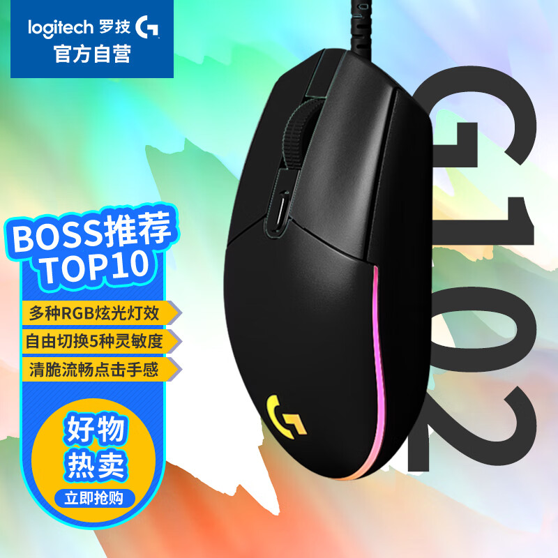 罗技(G)G102第二代游戏鼠标 RGB流光灯效鼠标 轻量化 游戏级8000DPI传感器 黑色 200-8000DPI