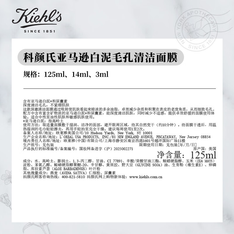 科颜氏(Kiehl's)全新第二代白泥清洁面膜125ml控油清洁毛孔去黑头 生日礼物