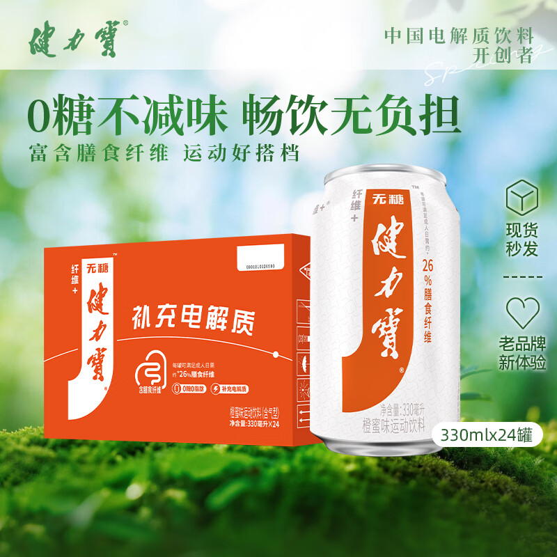 健力宝无糖0糖0脂含膳食纤维+橙蜜味330mL*24罐补充电解质碳酸饮料汽水