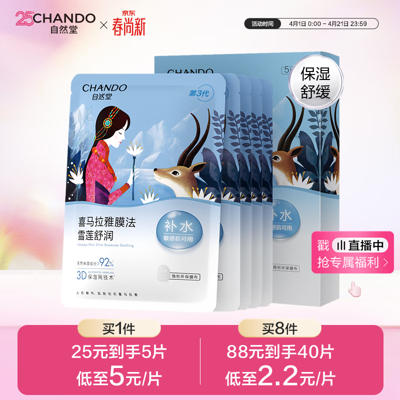 自然堂【周翊然同款】雪莲舒缓保湿面膜26ml*5 补水保湿滋润 敏肌