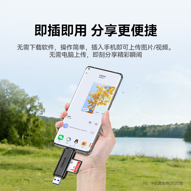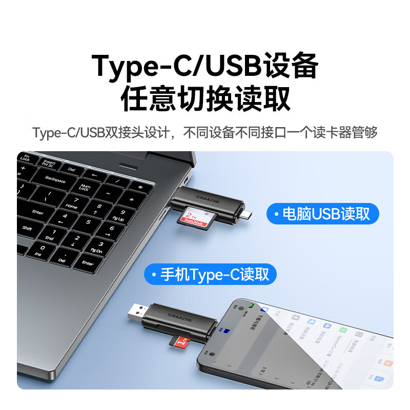 山泽USB/Type-C3.0高速读卡器SD/TF双卡适用USB-C电脑平板手机苹果17大疆无人机pocket3运动相机ccd