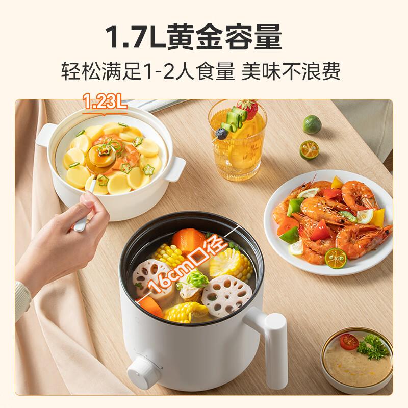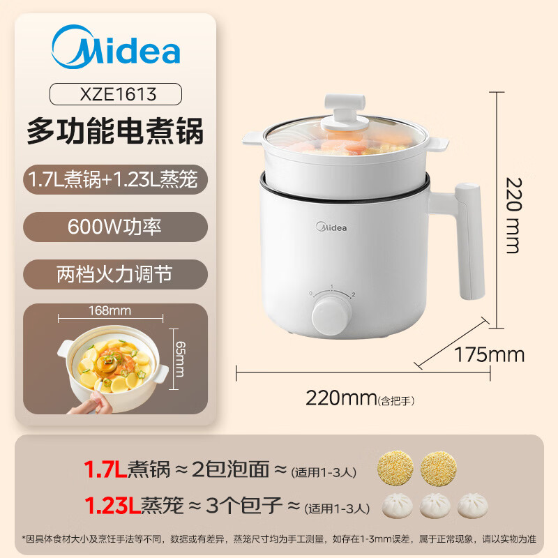 美的(Midea)电煮锅 宿舍小电锅 电蒸锅 学生寝室一体泡面小火锅电煮锅 多功能锅 电热锅 XZE1613 配蒸笼 1.7L