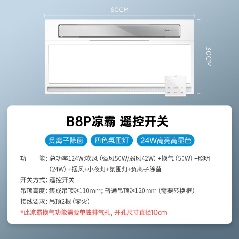 美的(Midea)凉霸厨房卫生间集成吊顶照明一体遥控排气换气吹风负离子除菌B8P