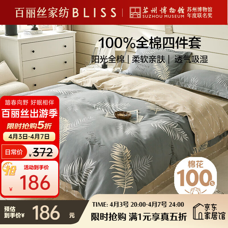 百丽丝水星家纺出品四件套床上纯棉100%全棉四件套被套床单被罩双人床上用品套件亲肤1.8m床