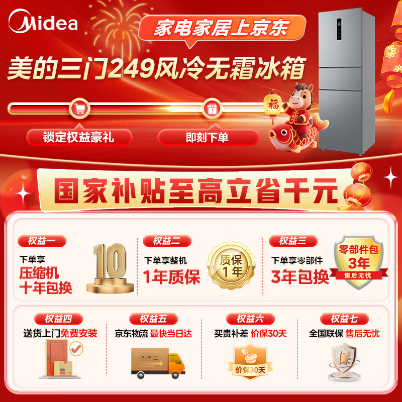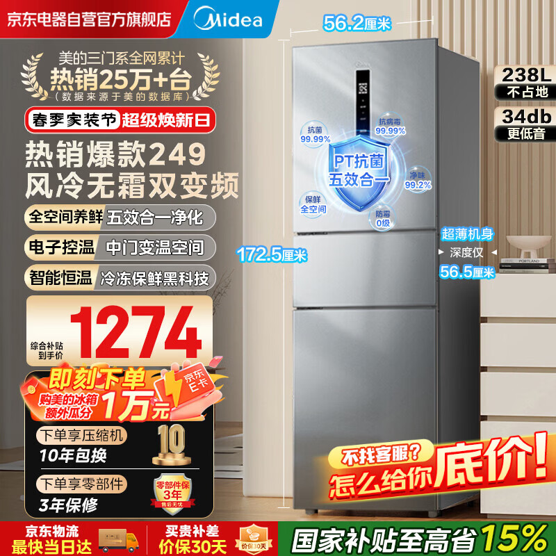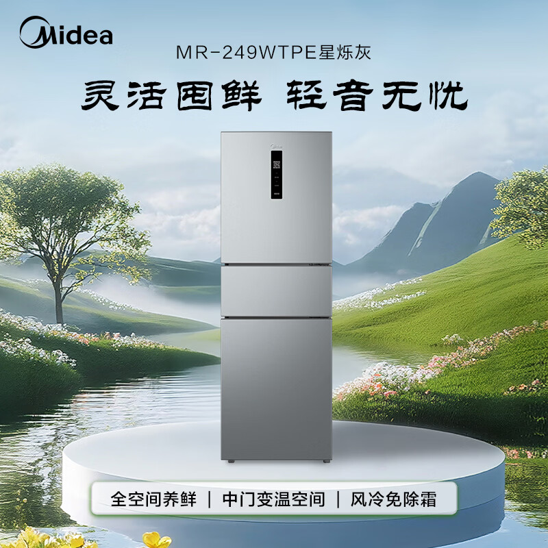 美的(Midea)249三门多门冰箱变频一级能效风冷无霜中门变温大冷冻空间节能低噪租房小型MR-249WTPE国家补贴
