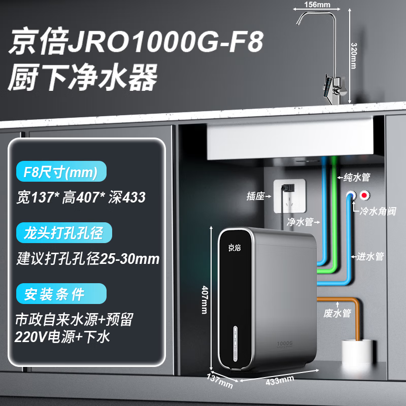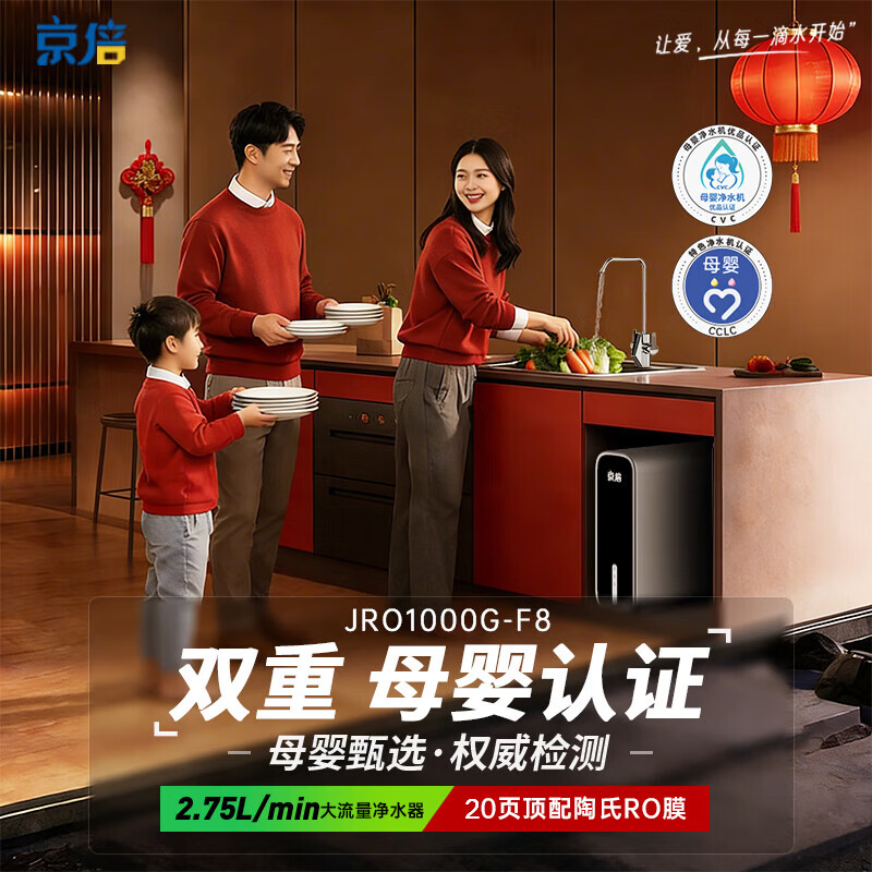 京倍F8双母婴认证净水器1000G大流量2.75L/min家用陶氏RO膜直饮机不含阻垢剂0陈水0双酚A