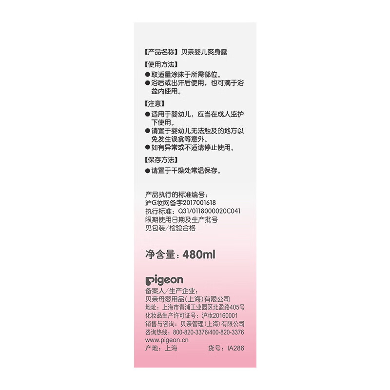 贝亲(Pigeon)桃叶精华 婴儿液体爽身露 家庭装 四季通用 480ml IA286