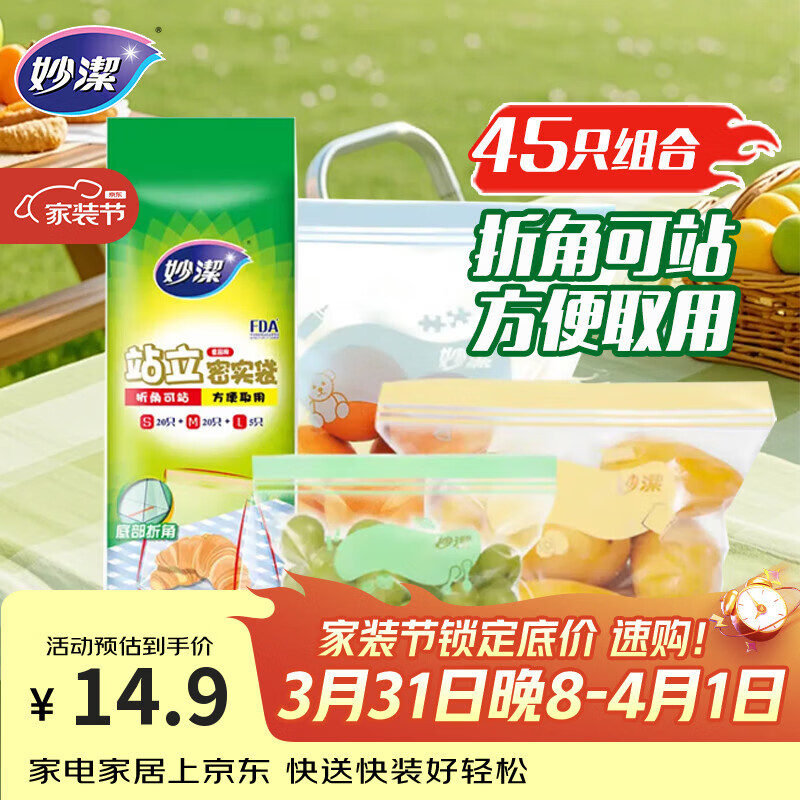 妙洁站立密封袋大中小号共45只密实封口袋食品级保鲜自封口塑拉链分装