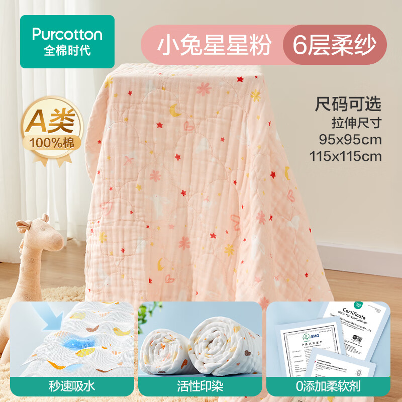 全棉时代婴儿浴巾儿童6层水洗纱布绗缝大毛巾小兔星星95*95cm1件装