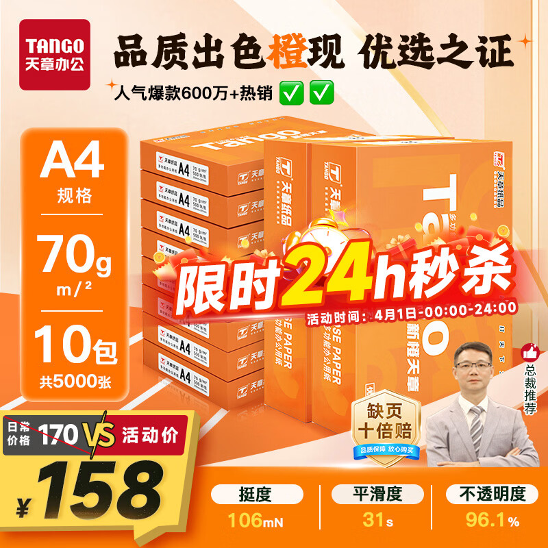天章 (TANGO)新橙天章A4打印纸70g500张*10包【优选品质】整箱5000张 双面打印复印纸 顺滑畅打高性价比