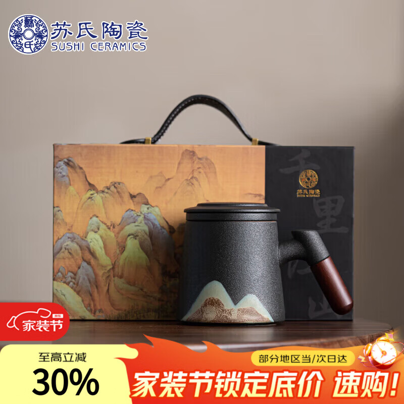 苏氏陶瓷办公杯手绘釉画彩千里江山聚财陶瓷内胆过滤泡茶杯伴手礼